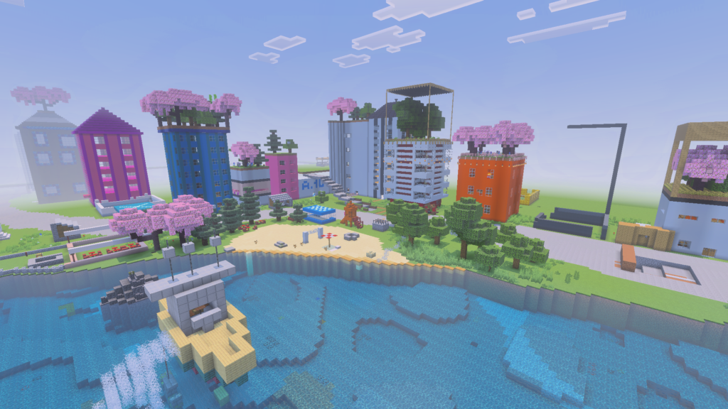 Tirebolu Bilim ve Sanat Merkezi olarak Minecraft’ evreninde Giresun’un Tirebolu ilçesini yaptık. Kırmızı-Beyaz olan ev benim evim. Üzerinde meşe ağacı ormanı ve minik bir tarla var. En üst katından aşağıya zincirlerle astığım fenerler takılı ama çok uzak olduğundan görünmemiş maalesef. Diğer evlerin yapımcıları benden biraz (şüpheli) esinlenmişler. Onlarda fener takmış ve orman yapmışlar ama onlar kiraz ağacıyla yapmış ormanlarını.